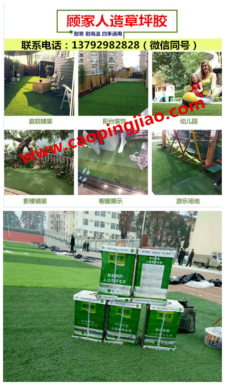 铺人工草坪用的胶水是:顾家草坪胶。联系电话:15588022228,顾家人造草坪胶水更具有粘性,能够有效的粘接人造草皮。粘接后的草坪会分外的紧,而且不会翘边。